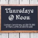 Thursdays at noon: Resumed on January 8th – Come join us for food, fellowship, and an interactive Bible study on 1 Corinthians at the Riverside Café. The lunch will start at noon, with the study afterward until about 1:30pm. Contact Carol Kraay at 208-571-2850 or Pastor Mark at 208-870-6008