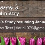 Women’s Ministry: Ladies- beginning 1/21 we will be studying “Breathe”- Priscilla Shirer’s book and video series on “making room for Sabbath” – This study offers an opportunity to discover and implement Sabbath margin- space for God to speak, room for you to hear; gleaning perspective in order to restore peace and rest to our daily…