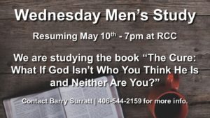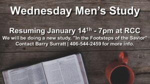 Men’s Wednesday Night Study continuing on Wednesday, January 14h at 7: We will be doing the study, “In the Footsteps of the Savior”. Contact Barry Surratt for more info | 406-544-2159