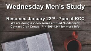Men’s Wednesday Night Study: Resumed on Wednesday, January 22nd at 7: We will begin a new video series entitled, “Godspeed,” by Matt & Julie Canlis. Contact Glen Crews for more info – 714-595-4244