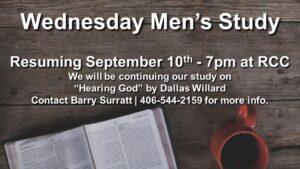 Men’s Wednesday Night Study: The men’s group resumes September 10th @ 7pm. We will be continuing our study on “Hearing God” by Dallas Willard.