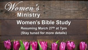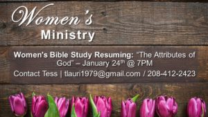 Wednesday Night Women’s Bible Study Resuming: January 24, 2024 – 7pm. They will be finishing up the Attributes of God which they were going through before they broke for the holidays.