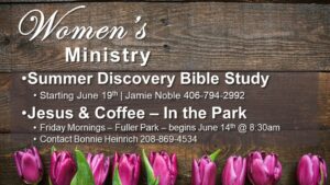 Women’s Ministry: New Women’s Bible Study: Starting June 19th. Women’s Ministry Summer Discovery Bible Study. This study involves reading a passage and retelling the passage along with a guided reflection as if studying through the eyes of a new believer. This summer we’ll be going through stories of hope in Luke. Wednesdays at 7:00pm- starting June 19th…