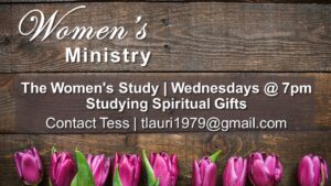 Women’s Study: Ladies, we’d love you to join us on Wednesday nights at 7pm as we study Spiritual Gifts- for more info email Tess at tlauri1979@gmail.com
