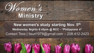 New Women’s Study: Ladies – please join us for a 3 week study on Philippians 4- November 5th thru 19th on Wednesday nights 6:45-8:30 pm. Sign up in the lobby today! See Kae Jensen or Tess for questions or to sign up.
