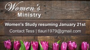 Women’s Ministry: Ladies- beginning 1/21 we will be studying “Breathe”- Priscilla Shirer’s book and video series on “making room for Sabbath” – This study offers an opportunity to discover and implement Sabbath margin- space for God to speak, room for you to hear; gleaning perspective in order to restore peace and rest to our daily…