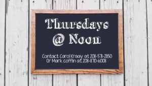 Thursdays at noon: Resumed on January 8th – Come join us for food, fellowship, and an interactive Bible study on 1 Corinthians at the Riverside Café. The lunch will start at noon, with the study afterward until about 1:30pm. Contact Carol Kraay at 208-571-2850 or Pastor Mark at 208-870-6008